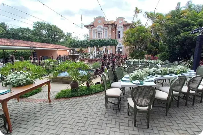 Um casarão histórico, a fonte central e os pátios iluminados compõem um cenário cinematográfico, perfeito para celebrações memoráveis.