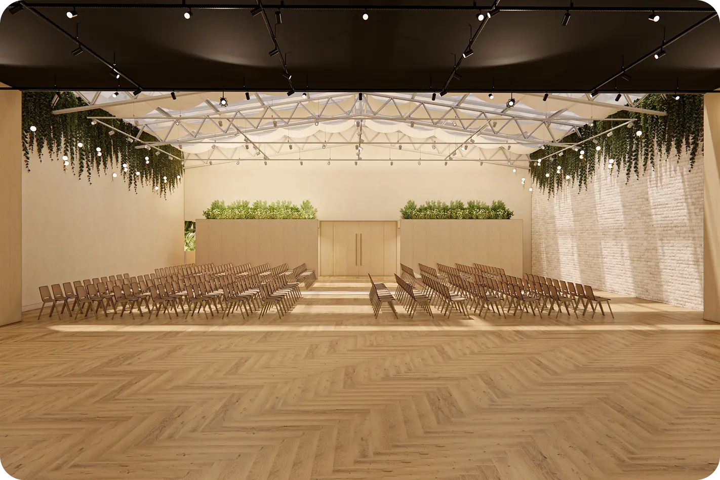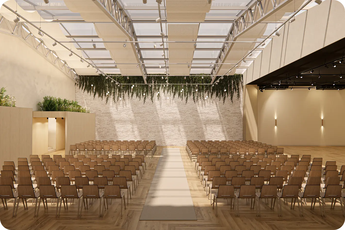 Com jardim acolhedor, teto transparente e parede retrátil, o espaço oferece versatilidade máxima para cerimônias marcantes, com uma estrutura moderna, versátil e surpreendente.